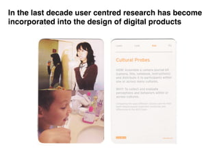 The document discusses the importance of early user research in the design of digital products, emphasizing its role in saving time and costs while enhancing quality. It argues that understanding user needs and synthesizing research into actionable insights is crucial for identifying design opportunities and solving problems effectively. The application of user-centered design from the project's start is highlighted as essential for creating successful user experiences.