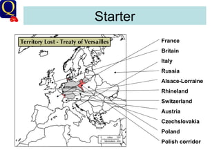 This document discusses the territorial disputes negotiated at the Treaty of Versailles. It outlines the positions of France, Britain, Italy and others on territories such as Alsace-Lorraine, the Rhineland, colonies in Africa, and the Polish Corridor. Students are assigned countries and must negotiate to reach agreements on the status of these disputed territories. Options considered include permanent control, independence, holding plebiscites, and mandates under the League of Nations. The activity aims to have students experience the complex compromise needed at Versailles.