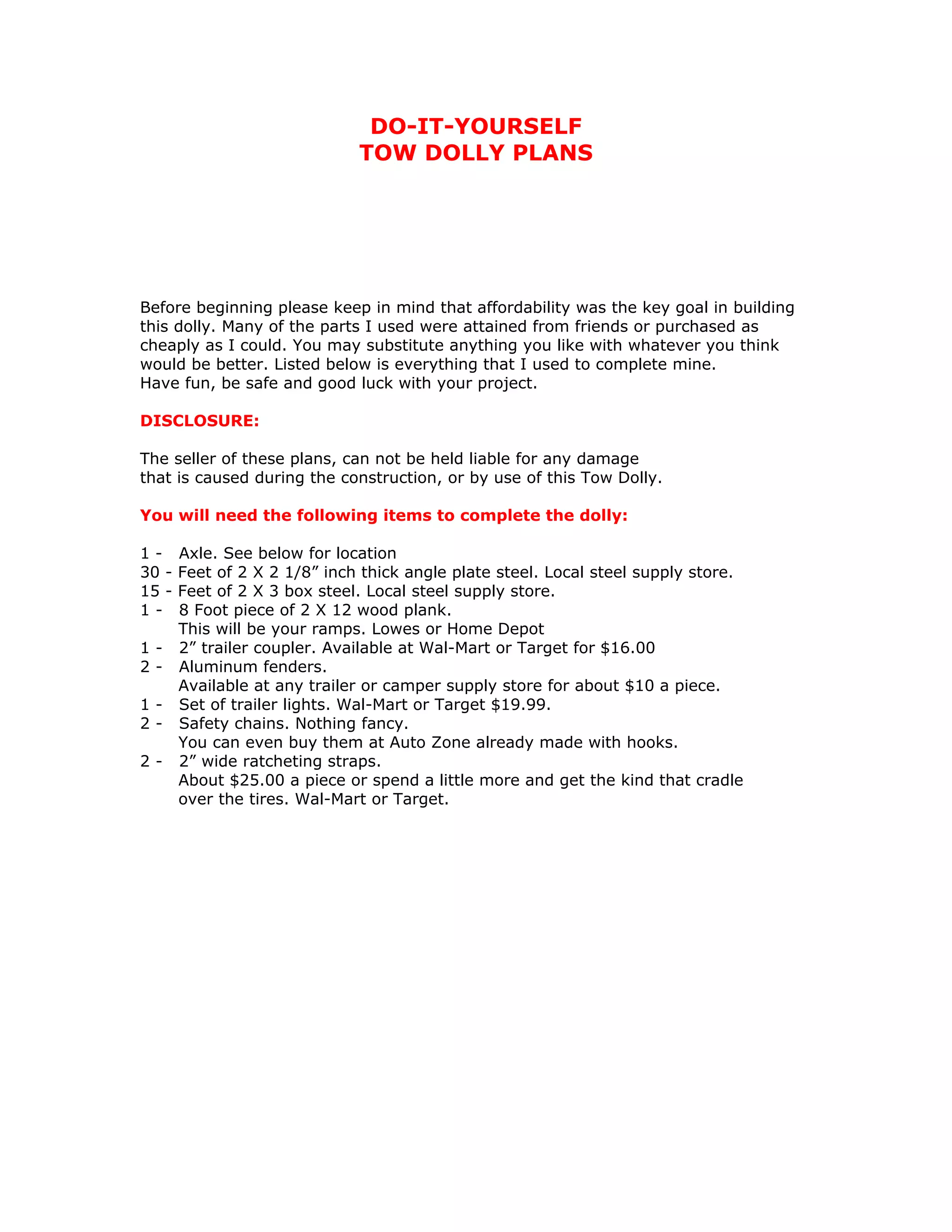 This document provides instructions for building a do-it-yourself tow dolly using readily available and inexpensive materials. It lists the necessary parts which include an axle from a Dodge Caravan, steel tubing, wood planks, lights, and other hardware. Detailed steps are provided to assemble the cradle, tongue, ramps, and attach other components like fenders and lights. Safety warnings are included to only tow with adequate tongue weight and take turns slowly when road testing.