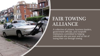 The Fair Towing Alliance addresses the severe consequences faced by low-income individuals who have their cars towed, leading to job loss, reduced access to education, and increased debt. Towing practices, often linked to tickets and registration issues, disproportionately affect the poor and strain government resources while worsening the financial and living conditions of families. The document advocates for public policy changes to mitigate these issues and emphasizes the legal implications surrounding towing practices.