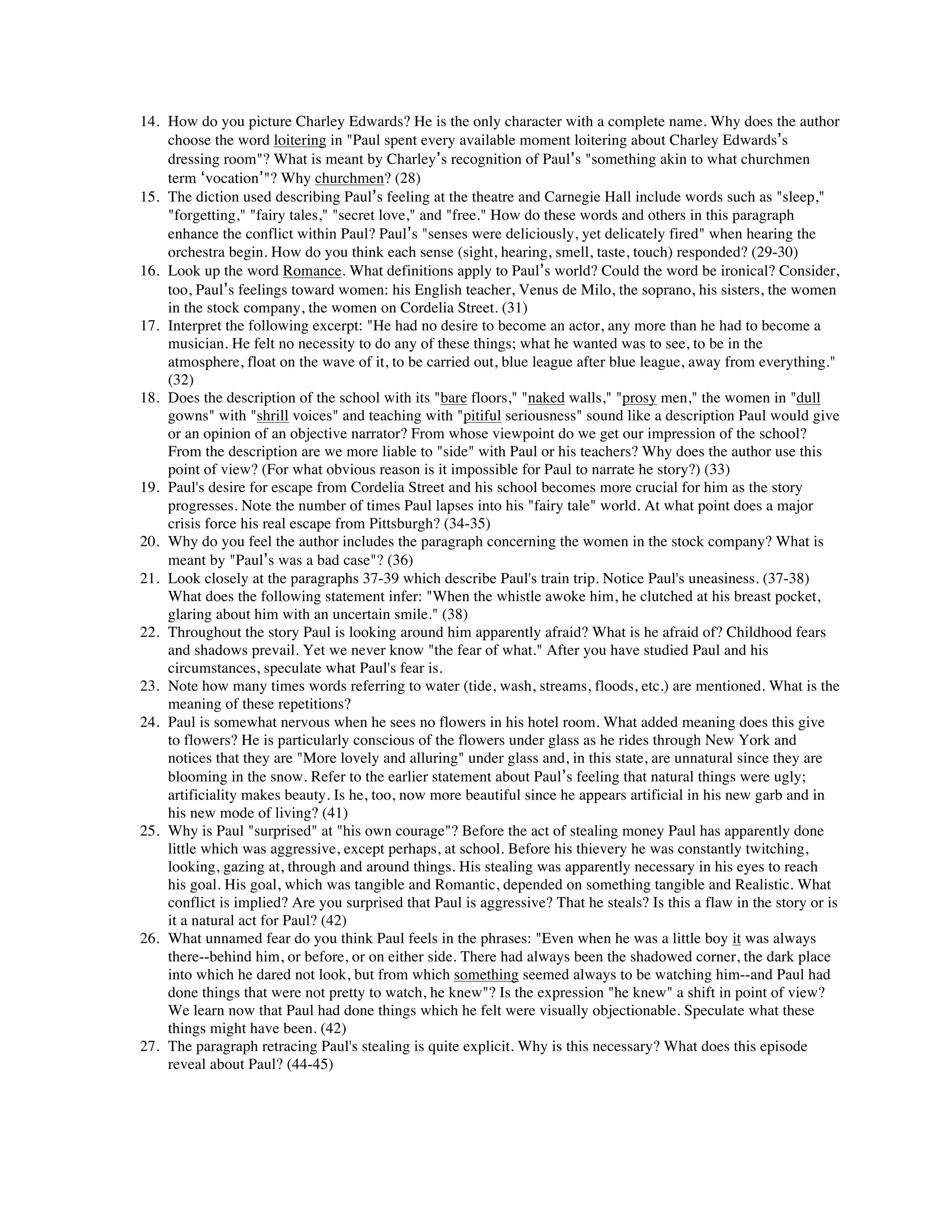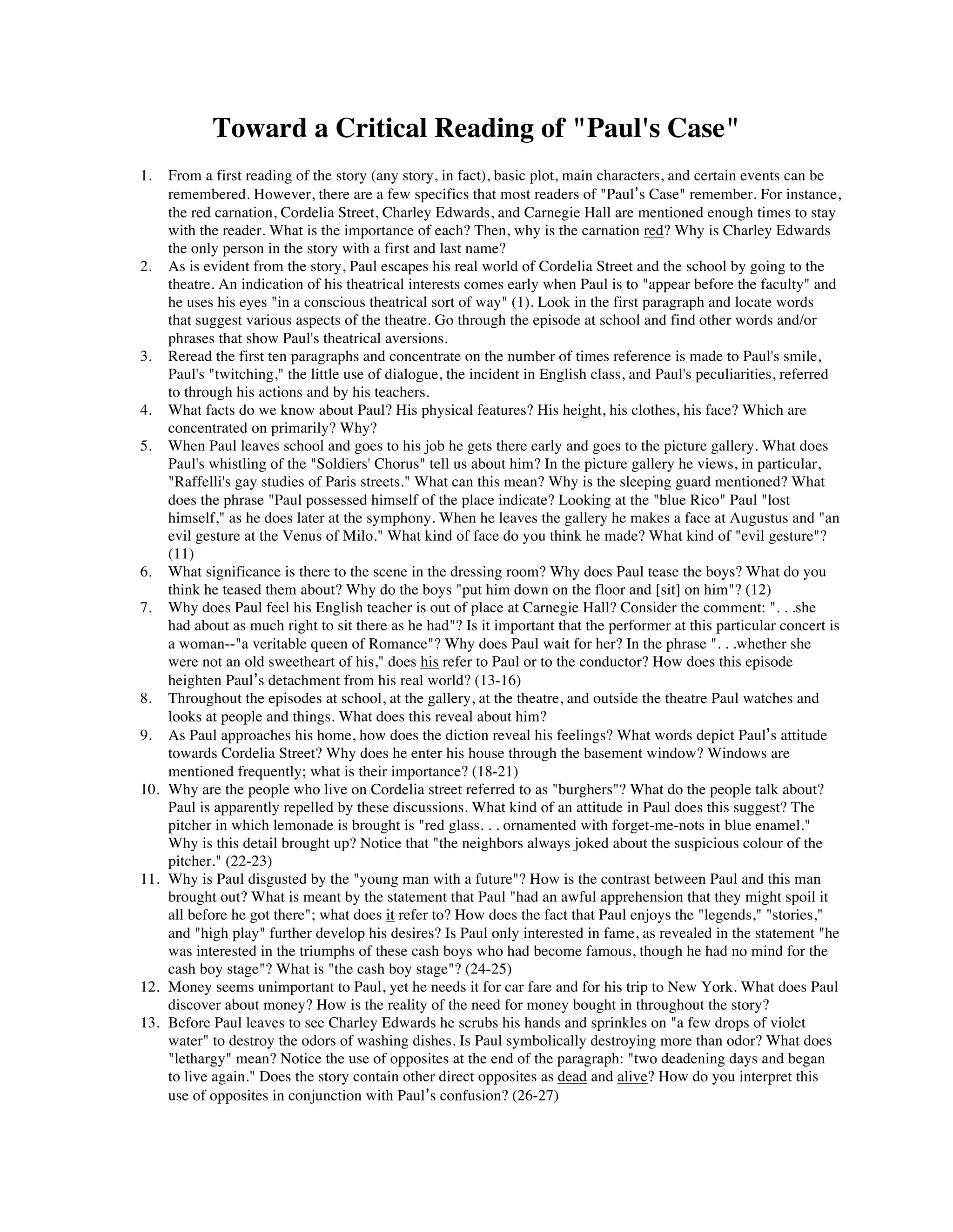 1. The document provides discussion questions about the short story "Paul's Case" by Willa Cather. It analyzes various elements of the story like Paul's behavior, his fascination with the theater, his escape from his life, and his eventual suicide.