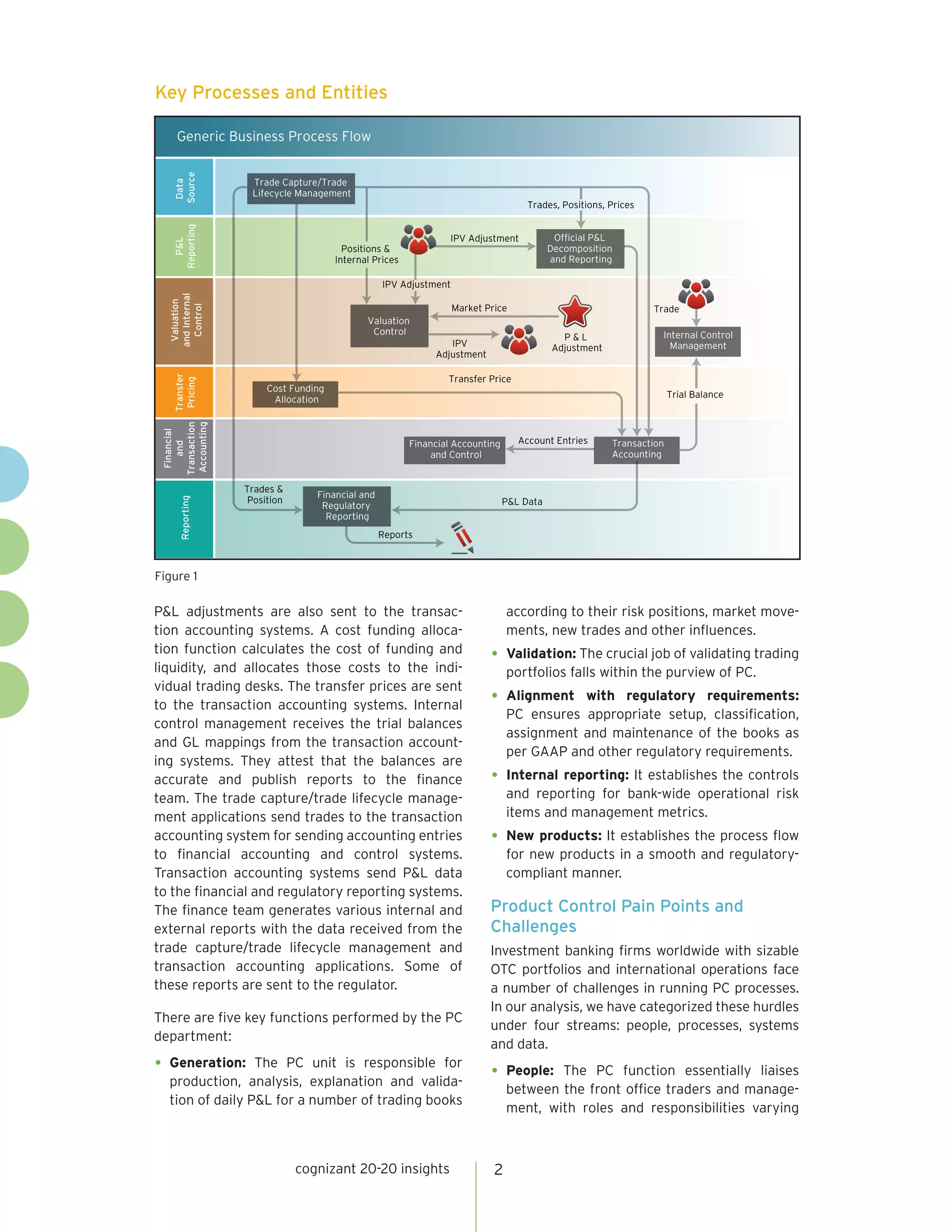 This document discusses the need for investment banks to rethink their product control departments given increasing regulatory scrutiny, interconnectedness of functions, and data complexities. It proposes establishing a new operating model and framework for product control with a focus on transparent and accurate valuations. Specifically, it recommends developing governance and operating models, a data acquisition and control framework, standardized processes for P&L, independent price validation, and funding allocation, as well as integrated workflow management. This would help address current challenges with people, processes, systems, and data across product control functions.
