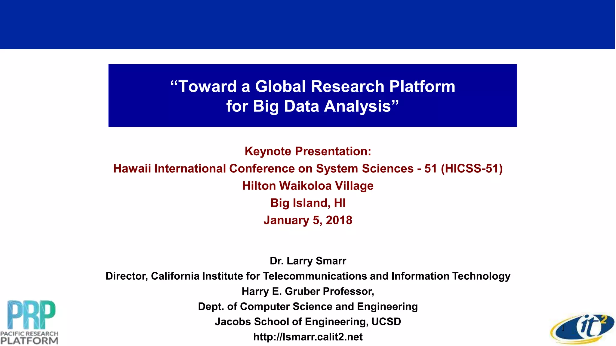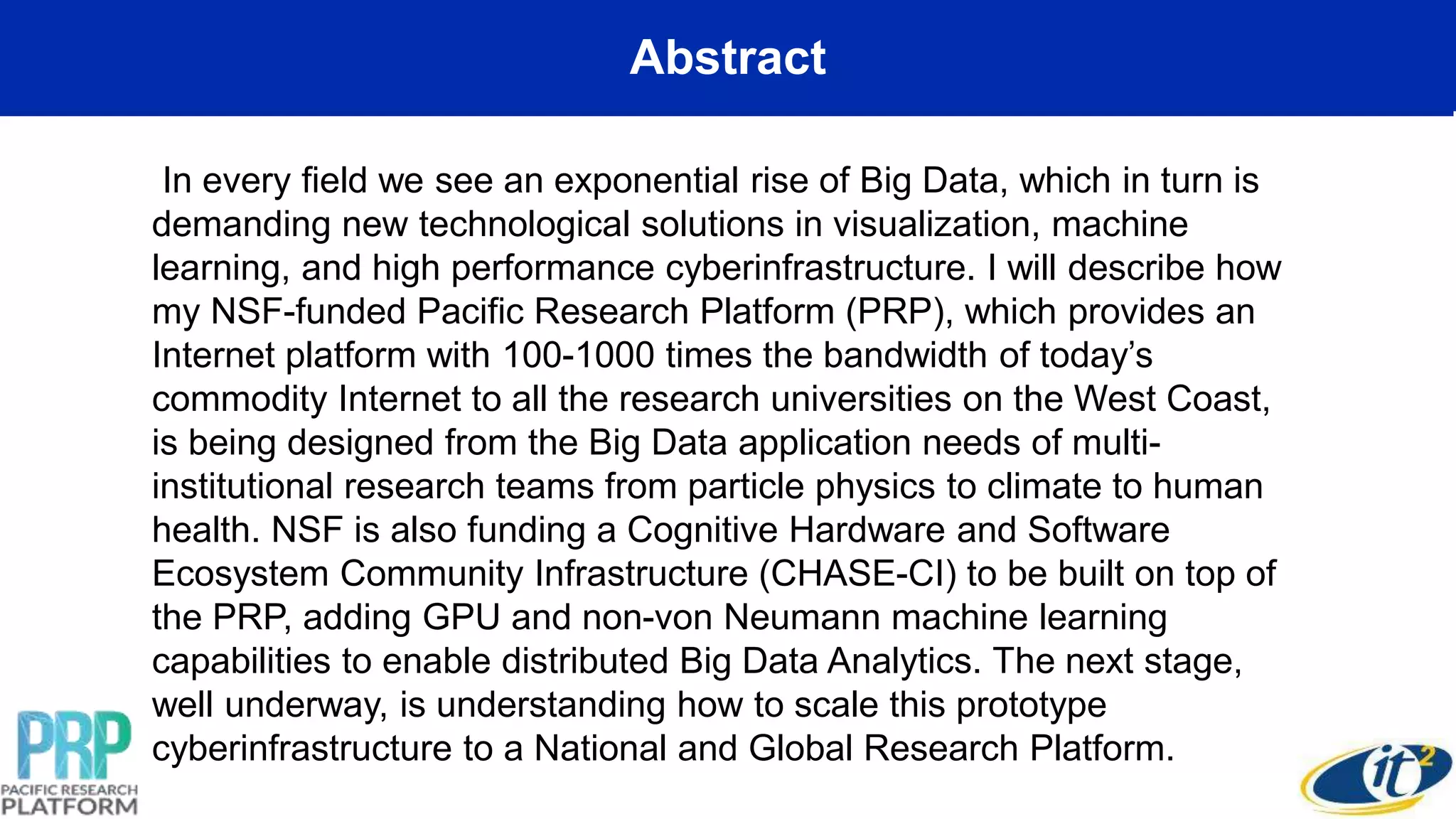 The keynote presentation discusses the exponential growth of big data and the need for enhanced cyberinfrastructure, highlighting the Pacific Research Platform (PRP) funded by NSF, which aims to connect research institutions with high-bandwidth internet. It outlines the development of a community infrastructure that supports distributed big data analytics and machine learning, while also addressing existing challenges such as campus-based network capabilities. The presentation emphasizes the vision of creating a national and global network for big data research, enhanced by collaborations and technological innovations.