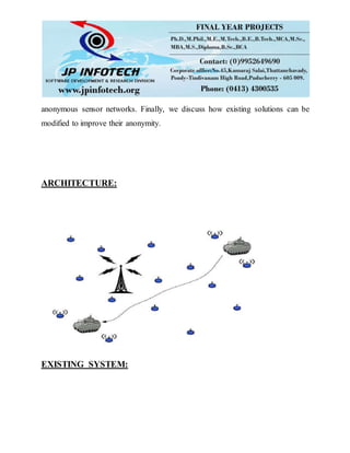This document proposes a new statistical framework for modeling, analyzing, and evaluating anonymity in sensor networks. The framework introduces the notion of "interval indistinguishability" to quantitatively measure anonymity. It maps the source anonymity problem to the statistical problem of binary hypothesis testing with nuisance parameters. Existing solutions are analyzed using this framework, showing how anonymity can be improved by finding an appropriate data transformation to remove nuisance information. Mapping the problem to binary hypothesis testing opens opportunities to apply coding theory to anonymous sensor networks.