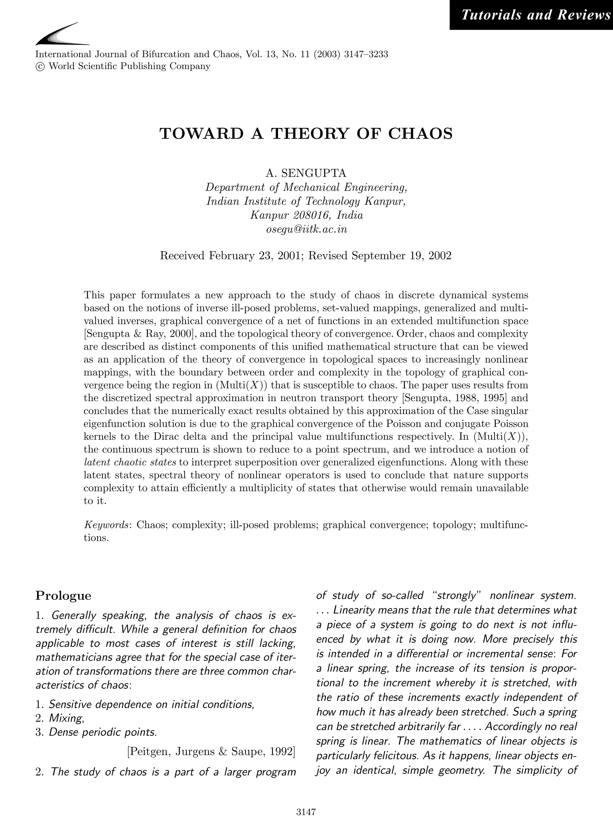 2. This paper formulates a new approach to studying chaos in discrete dynamical systems based on concepts from inverse problems, set-valued mappings, graphical convergence theory, and topology. The author argues that order, chaos and complexity can be viewed as parts of a unified mathematical structure applying topological convergence theory to increasingly nonlinear mappings.