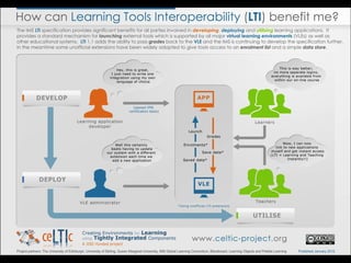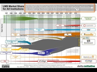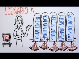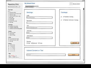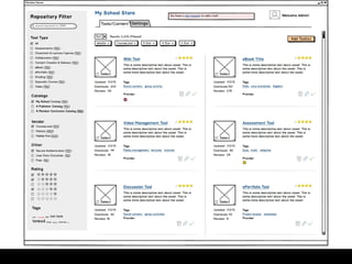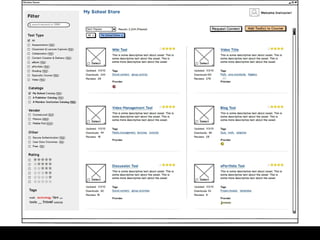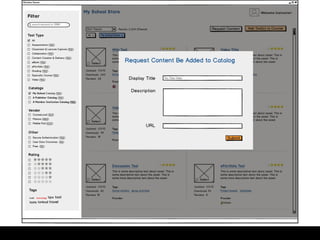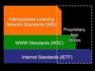 This document presents a vision for an open and transparent learning ecosystem centered around an IMS App Store. It outlines some of the current challenges with platforms, tools, and content being redundant and non-integrated. The original LMS design was more transactional and administrative rather than focused on open, participatory learning. However, educational institutions can guide their own destiny by working together through open solutions rather than depending on closed systems. The proposed IMS App Store aims to provide services like credentials, ratings, and catalogs to help connect tools, content, and users in a more transparent way and transform the learning experience.