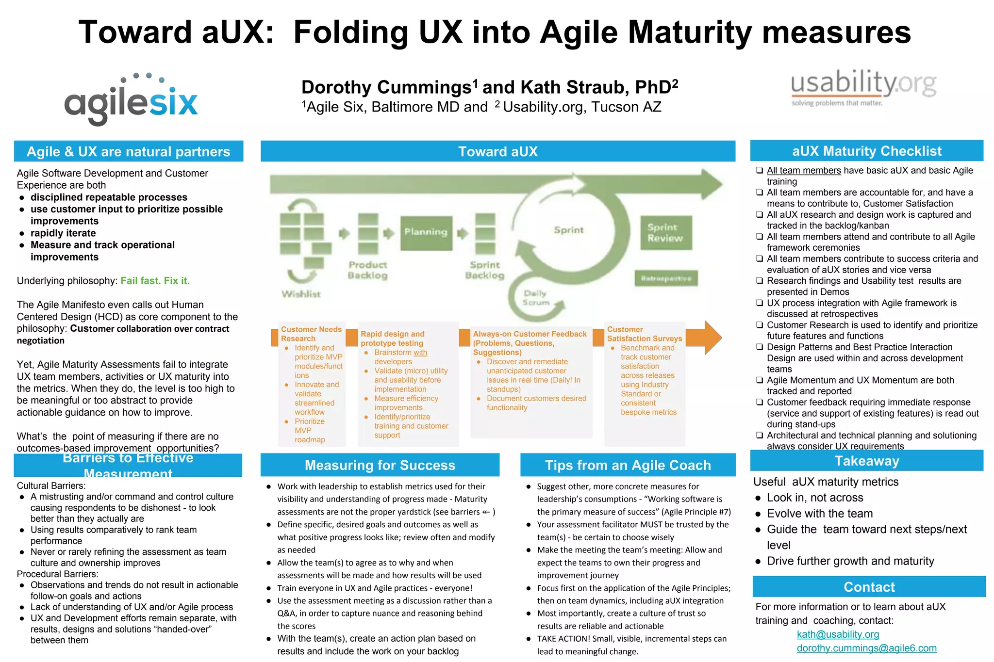 The document discusses the integration of user experience (UX) into agile maturity metrics, emphasizing the importance of accountability, regular assessment, and active participation from all team members. It identifies barriers to effective measurement, including cultural and procedural obstacles, and advocates for a culture of trust and actionable goals to improve outcomes. Key recommendations include involving leadership in establishing metrics, setting specific goals, and fostering continuous training in UX and agile practices.