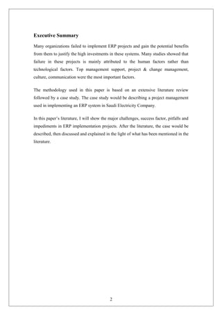 This document provides an executive summary and table of contents for a project report on quality management for an ERP implementation project at Saudi Electricity Company. The report will use a case study approach, first reviewing literature on critical success factors for ERP implementations including top management support, project management, and change management. It will then describe the ERP implementation project at SEC and analyze it in light of the literature.