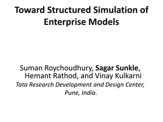 The document discusses the integration of enterprise architecture (EA) models with system dynamics (SD) models to better understand the dynamic behavior of enterprises. It outlines the key components of both modeling approaches, the need for a specialized SD metamodel, and the challenges involved in transforming EA models into SD models for simulation purposes. The authors emphasize the potential for context-based transformations but acknowledge limitations in validating larger models and the absence of immediate simulation semantics.