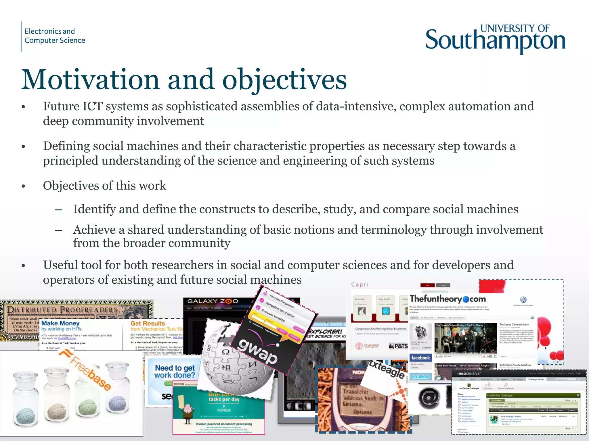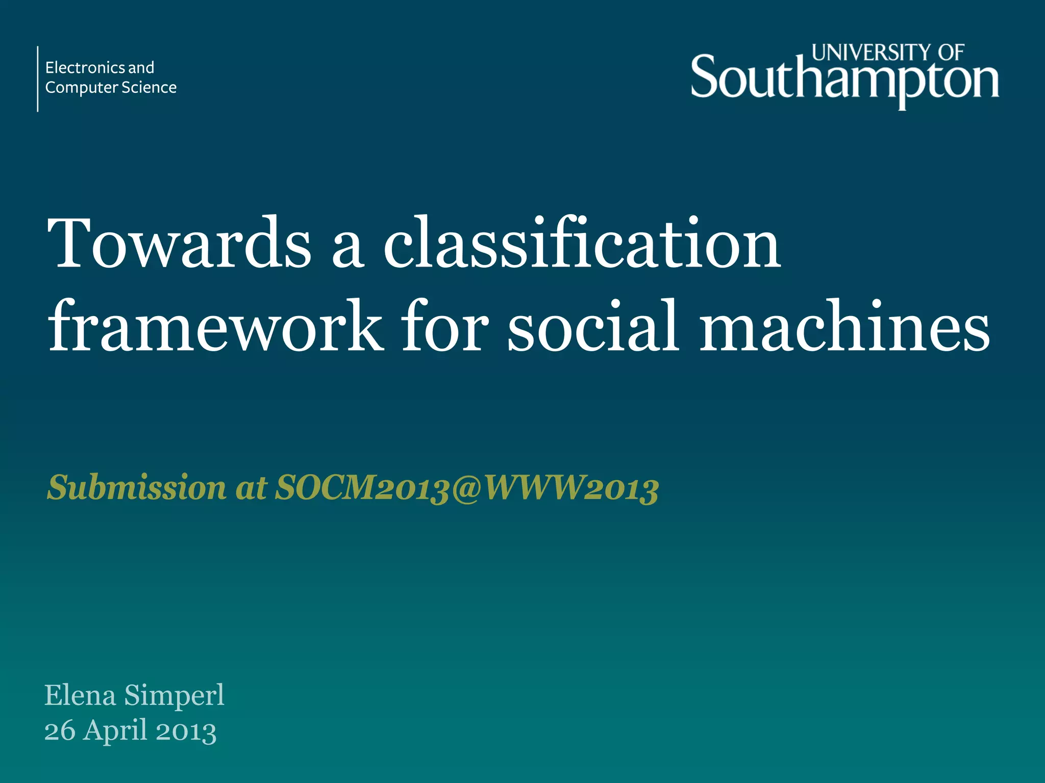 This document proposes a framework for classifying social machines. It defines social machines as systems involving both algorithmic and social components that interact and evolve over time. The objectives are to identify constructs for describing and comparing social machines. A methodology elicited constructs from examples of social machines. The resulting classification framework clusters constructs around general description, purpose/tasks, participants/roles, motivation/incentives, and technology. Next steps involve evaluating the framework's completeness and usefulness for describing existing social machines. The goal is a shared understanding to advance research and development of these complex, evolving systems.