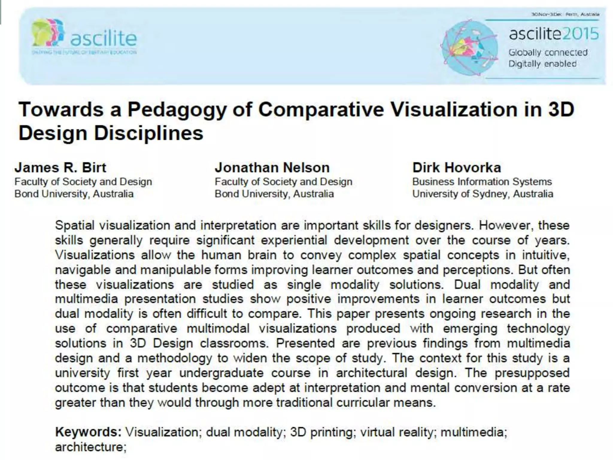 The document discusses a study on the comparative use of visualization media in 3D design education, highlighting the importance of spatial visualization skills and the benefits of dual modality (2D, VR, and 3D physical representations). It analyzes undergraduate architecture students' experiences with different media, focusing on engagement, communication, and learning objectives. The findings suggest that learner perceptions and preferences for visualization technologies evolve over time and are influenced by specific tasks.