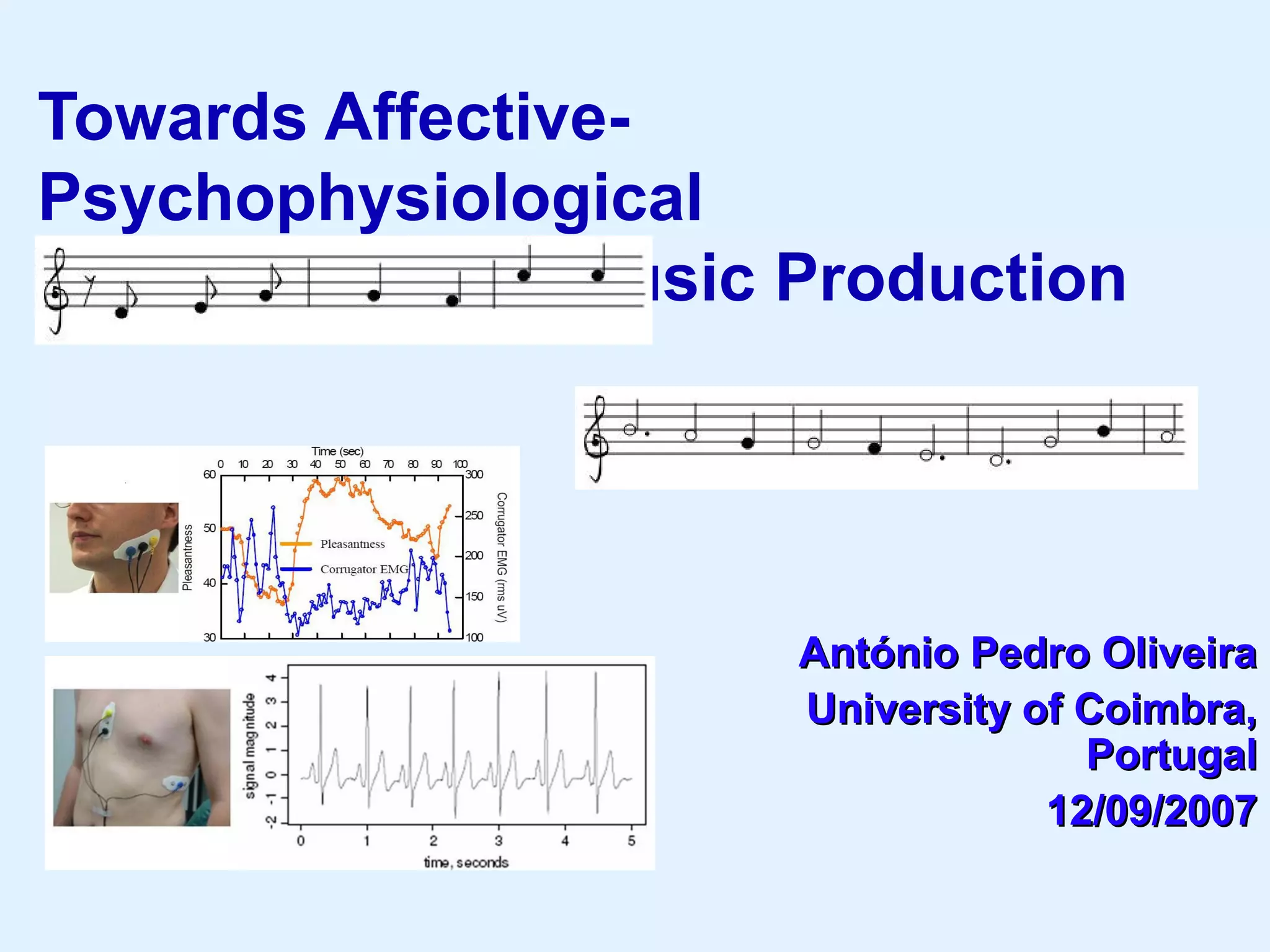 This document outlines a methodology for developing an affective-psychophysiological model of music production. The methodology involves representing emotions in dimensional space, creating an affective music knowledge base linking musical features to emotional arousal and valence, and manipulating music segments to produce emotional outputs. The emotional outputs will be validated using psychophysiological measures and self-reports to assess the perceived and induced emotions. The goal is to design a computational model of music production grounded in affective and psychophysiological foundations that can reliably express and induce emotions through music.