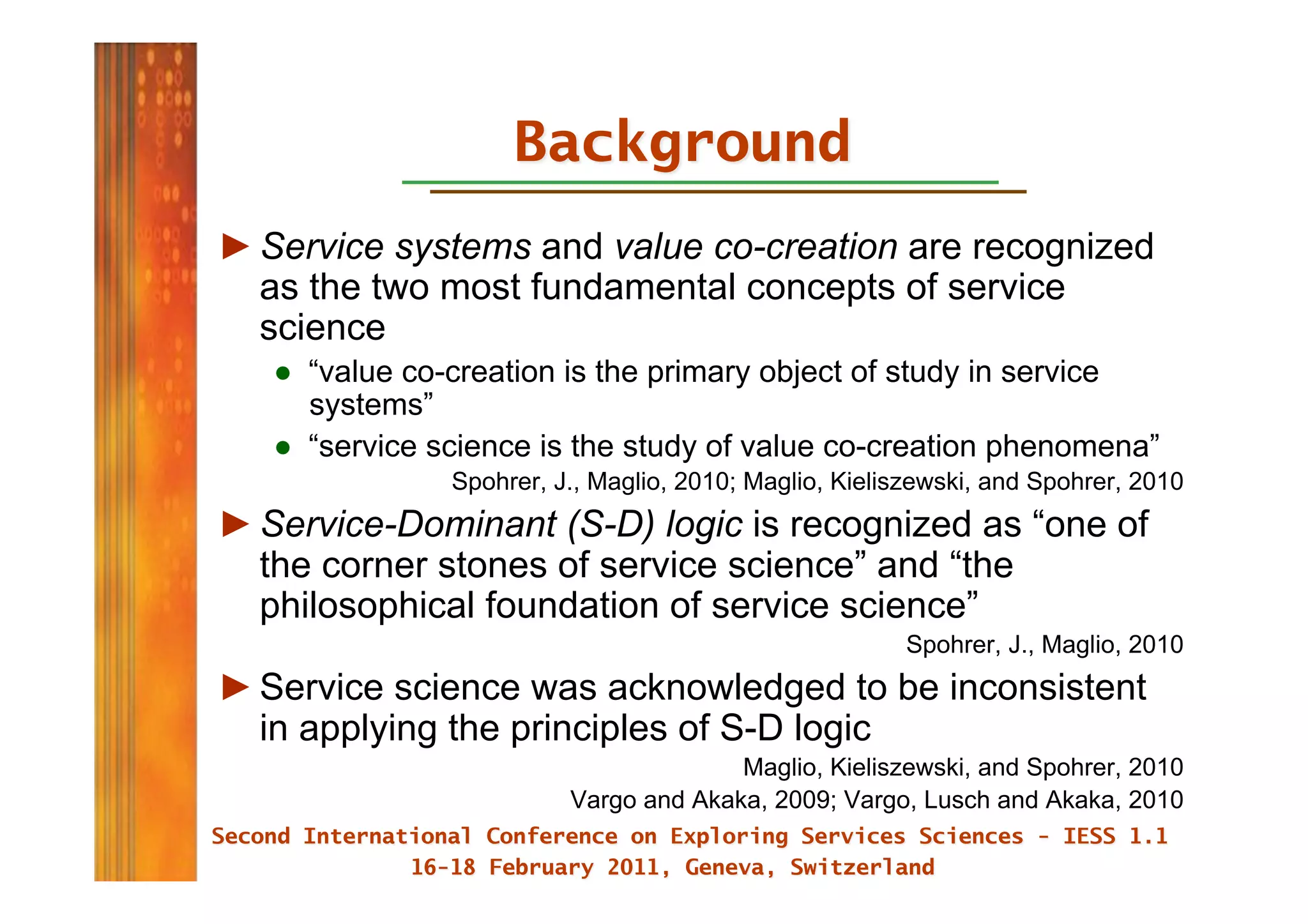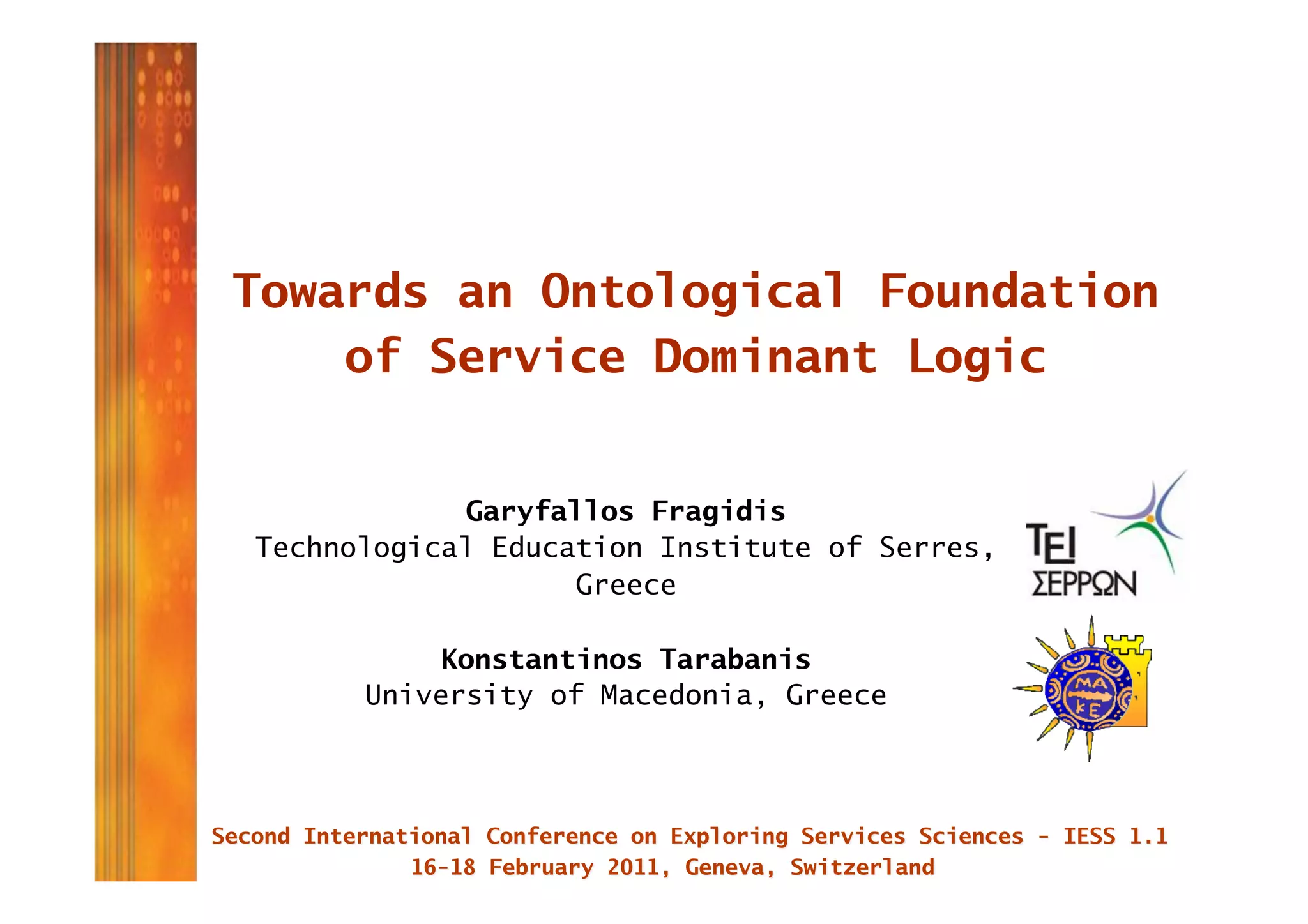 The document proposes an ontological foundation for service-dominant logic based on a literature review and conceptual modeling. It develops a class diagram ontology of key concepts in service-dominant logic including actors, services, value co-creation, resources, and contexts. The ontology is intended to clarify concepts, resolve inconsistencies, and establish a common vocabulary for multidisciplinary collaboration in service science. Future work could expand the foundational ontology and develop domain-specific ontologies to further conceptualize service-dominant logic.