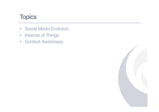 The document discusses the emergence of context awareness and its importance for next generation CRM. It describes how social media, the internet of things, and data from various sensors can provide contextual insights about users. Context is defined as having multiple layers including transactional, spatial, temporal, attitudinal, and lifestream aspects. The document promotes Mobius Innovations' approach to context-aware marketing by continuously conversing with customers and embedding real-time analytics to personalize experiences across different touchpoints.