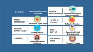 This document discusses design thinking as a methodology for developing solutions to complex problems and its potential application in academic staff development. It provides context on challenges around technology uptake in teaching/learning. It also describes a study interviewing "eLearning champions" at a South African university, finding commonalities in their mindsets that mirror design thinking dimensions. These include taking a human-centered approach through activities like persona creation and user journeys. The document concludes by questioning whether and how design thinking skills can be learned and applied in mainstreaming technology use and a decolonized higher education project.