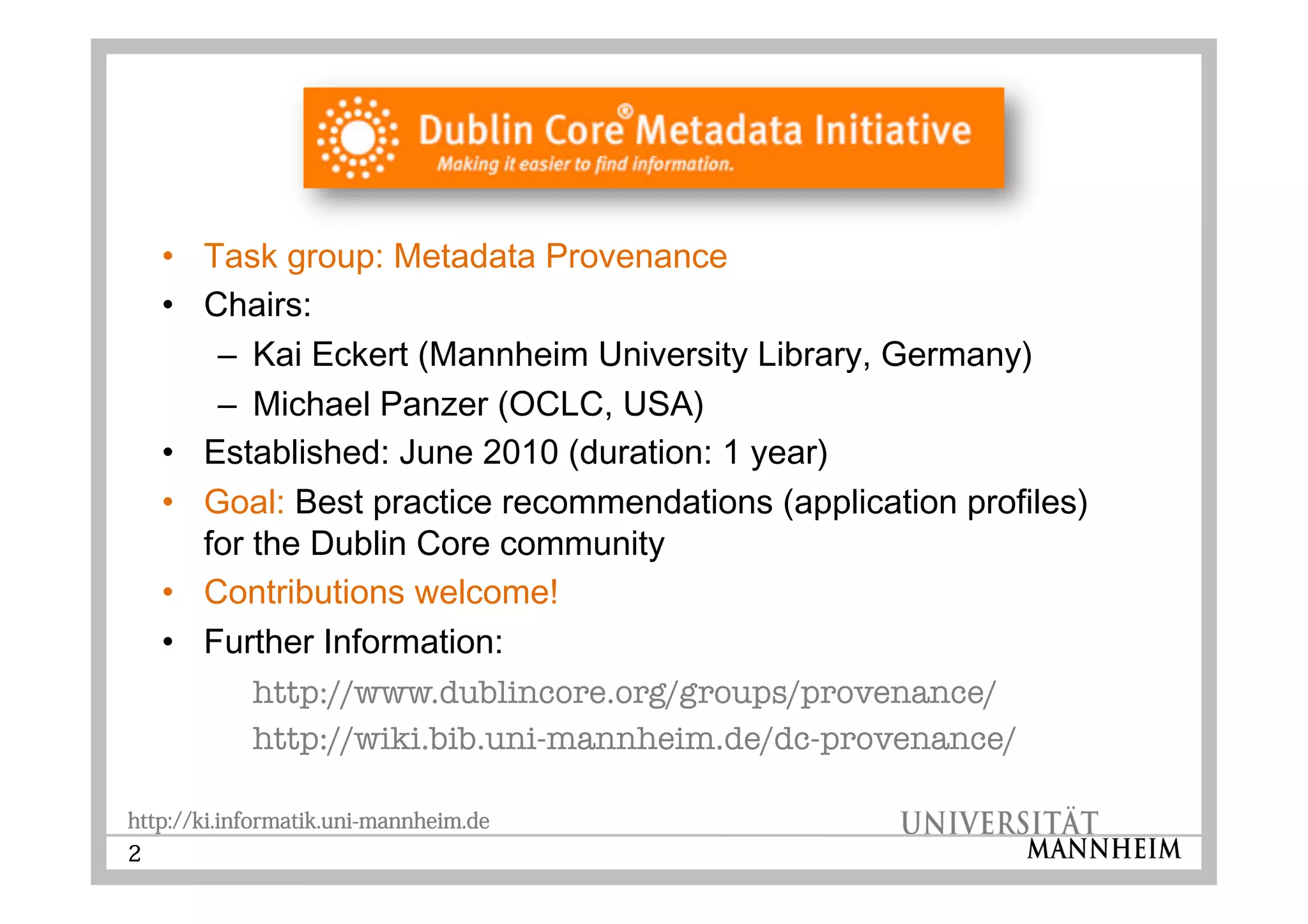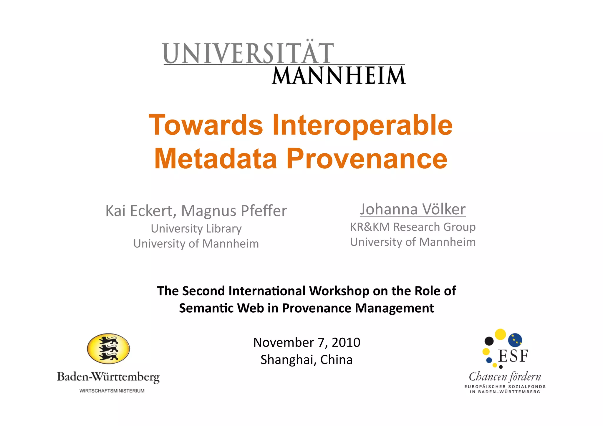 The document discusses metadata provenance and proposes a model for tracking the provenance of metadata using named graphs and semantic web technologies. Key elements of the proposed model include using named graphs to represent different metadata sources, tracking the source and confidence value of metadata using semantic triples, and executing SPARQL queries to retrieve metadata based on provenance information like source or confidence value.