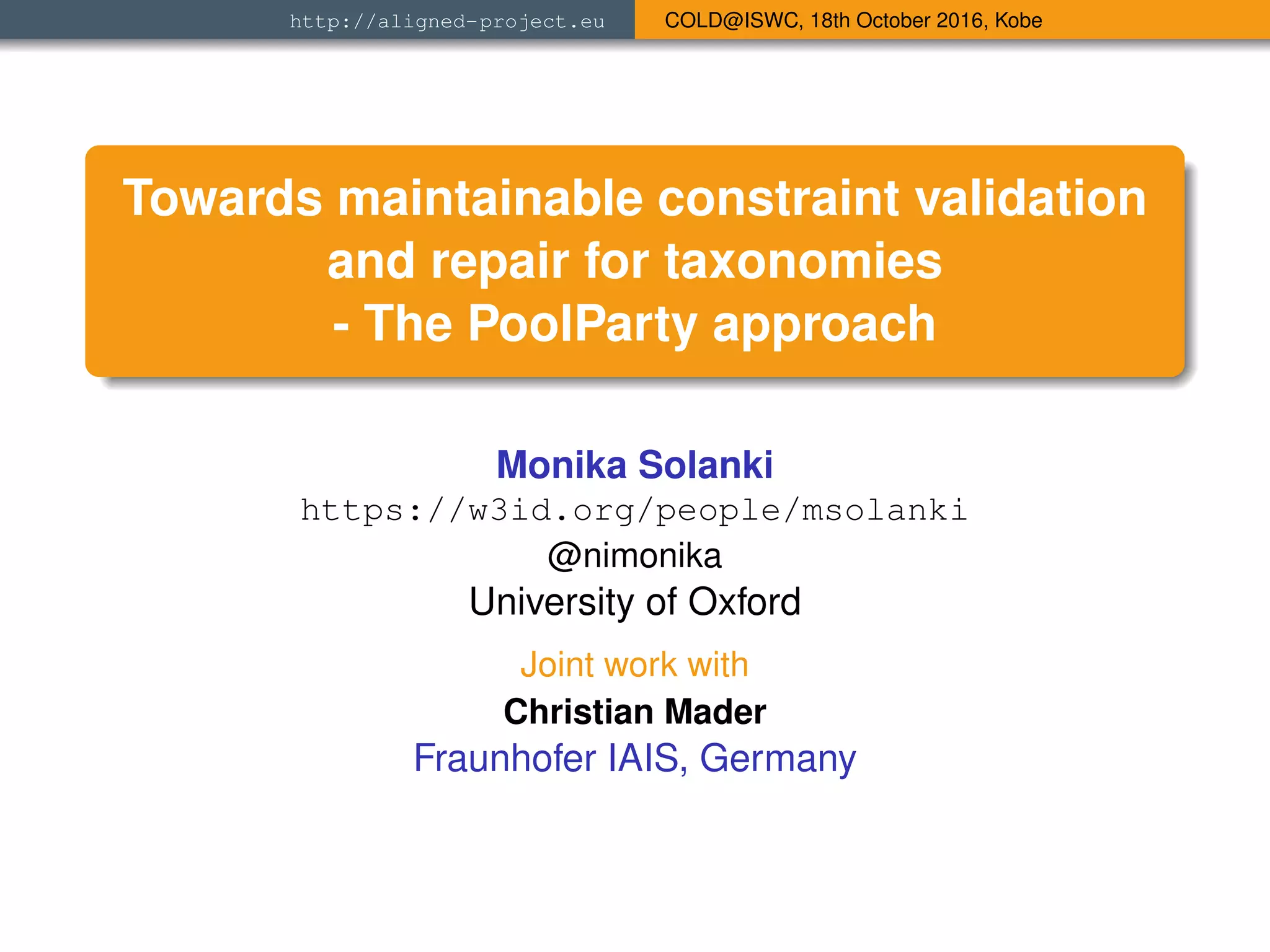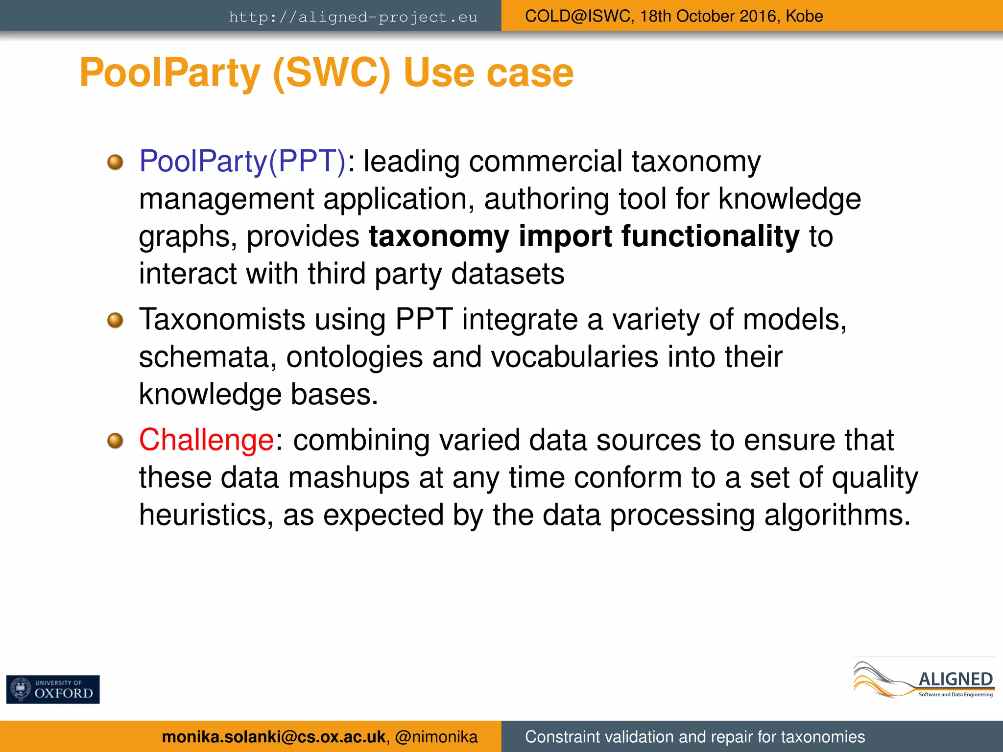This document discusses an approach used by PoolParty (PPT) to validate and repair taxonomies integrated from various data sources to ensure they conform to quality heuristics. It specifies data constraints using SHACL, validates datasets for violations, and combines formal constraint definitions with reusable repair strategies that can automatically resolve violations. The approach was tested on PPT-generated and third-party datasets, with validation performance varying based on dataset size and structure, and repair strategies scaling well to larger datasets.