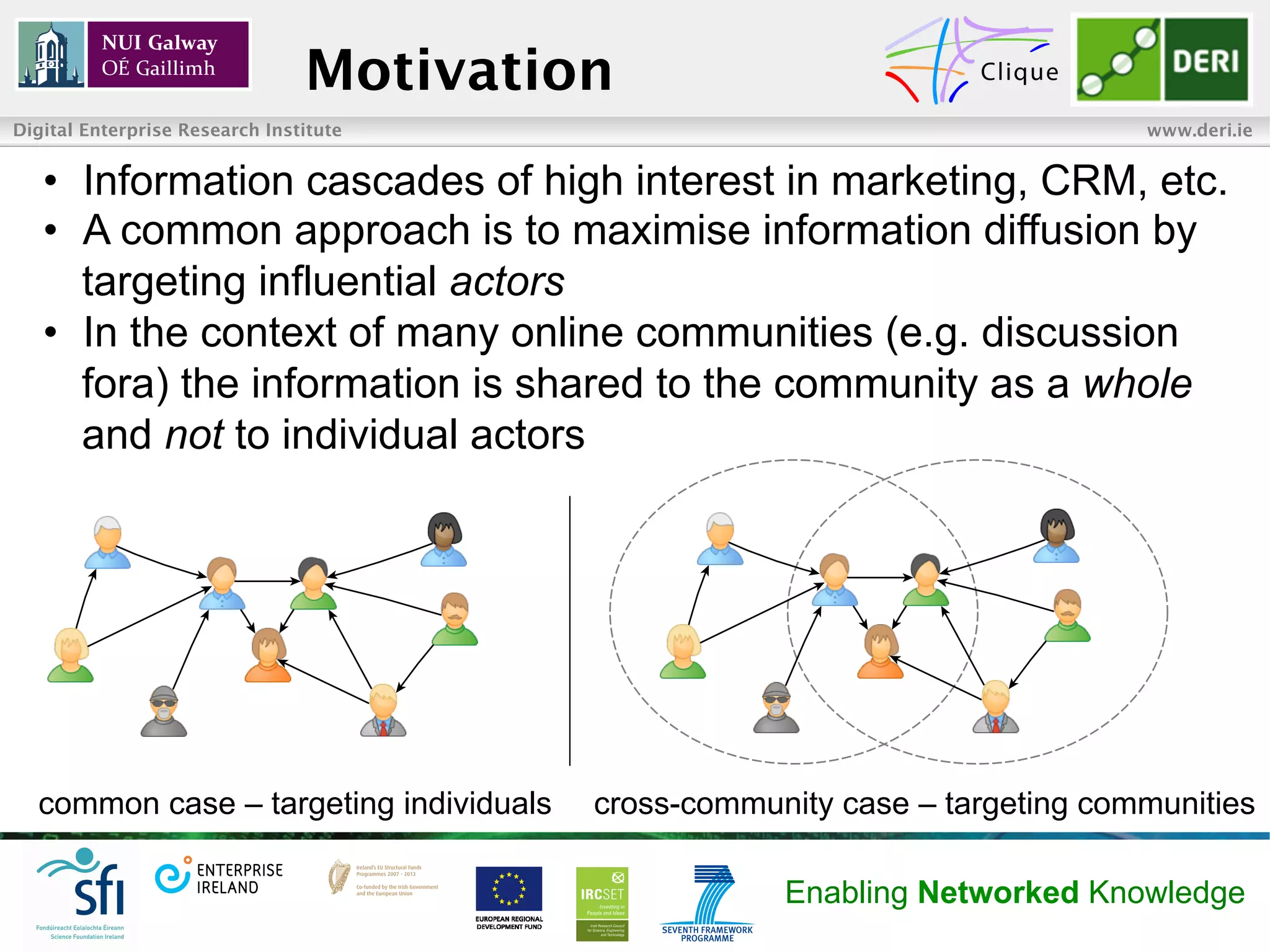 The document summarizes research on maximizing information diffusion across online communities. It aims to spread a message across an information flow network by targeting influential communities. The researchers define methods to measure community impact and propose targeting based on impact and entropy. Evaluation on two datasets shows their impact focus approach outperforms others for small numbers of targeted communities and seed users, achieving diffusion of information to 80% of users or communities.