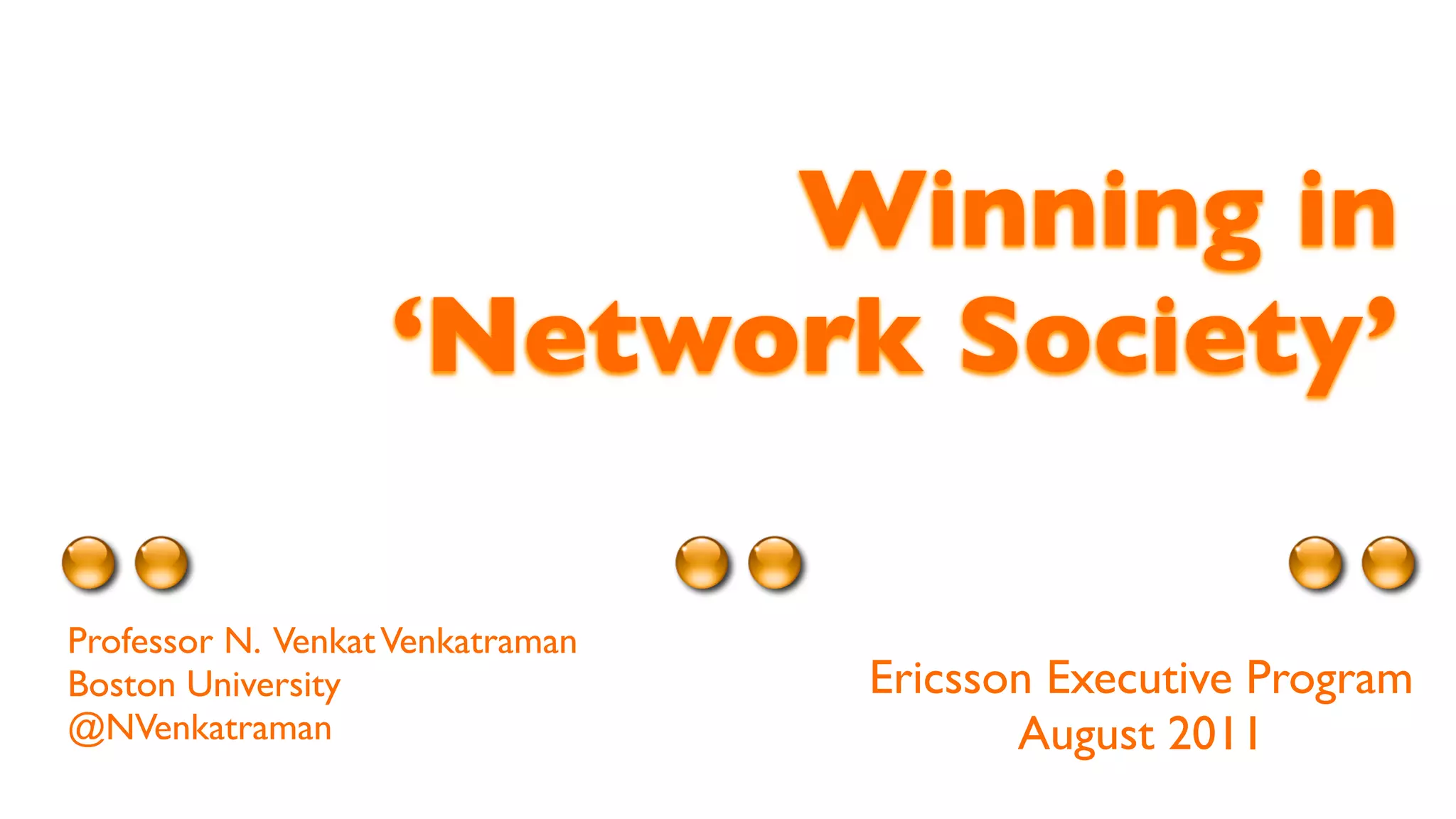 The document discusses the concept of a 'network society' and how it impacts business strategies in the digital era. It emphasizes the importance of adapting to new business model innovations and the shifting landscape driven by mobile, social, media, real-time, and machine webs. Successful companies must navigate these complexities to better meet customer demands and redefine their roles within emerging business networks.