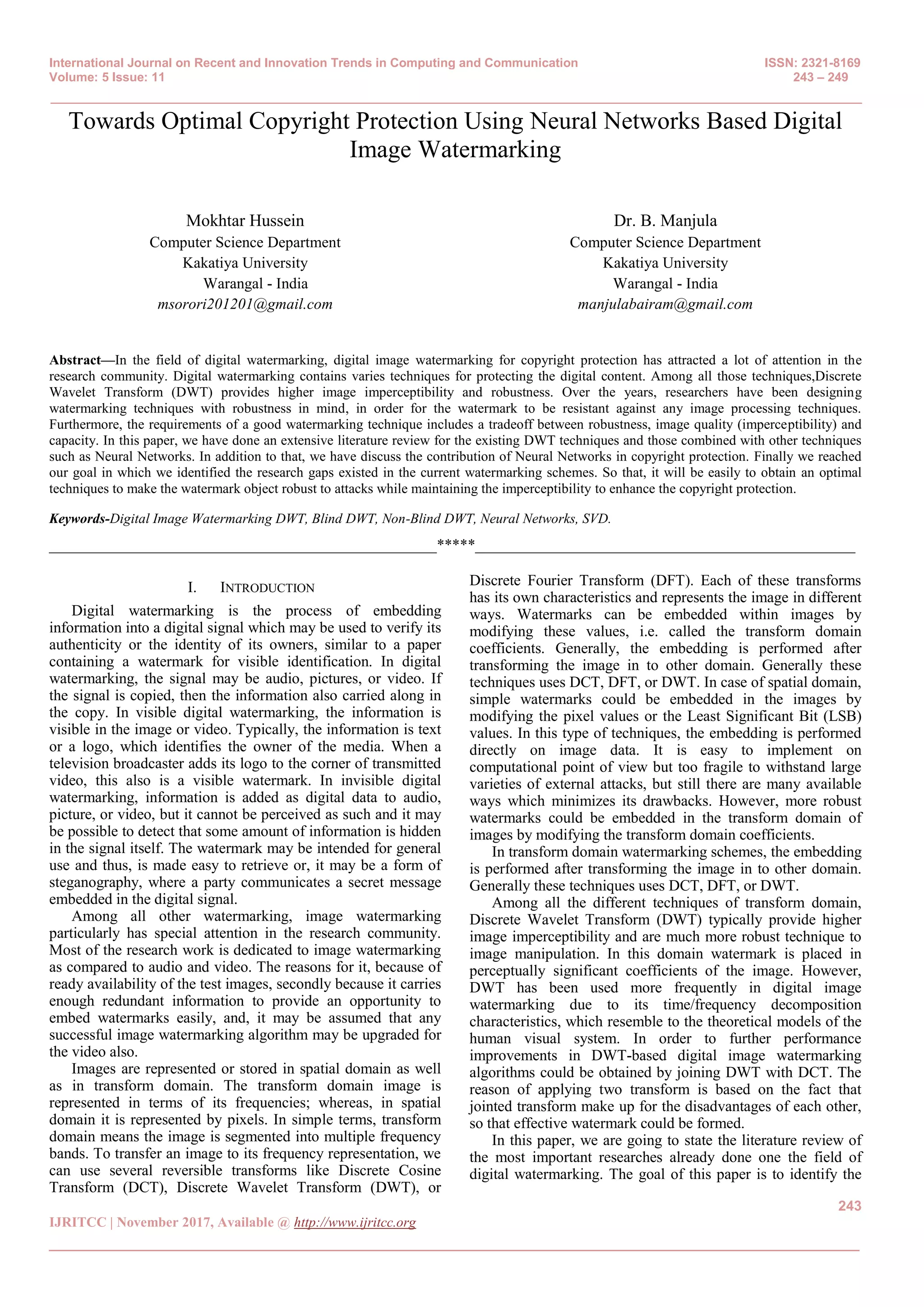 The document presents a literature review on digital image watermarking techniques with a focus on discrete wavelet transform (DWT) for copyright protection. It highlights the trade-offs between robustness, imperceptibility, and capacity in watermarking schemes, and discusses the integration of neural networks to enhance watermarking effectiveness. The paper identifies existing research gaps and aims to propose optimal solutions for improving watermark robustness against attacks while maintaining image quality.