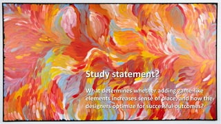 The document discusses how game-like elements can enhance the user experience in specific locations by fostering a sense of place through design science research and augmented reality gamification. It outlines the relationship between place attachment, gamification, and service marketing, emphasizing the value created through interactive and engaging experiences. Examples of user feedback highlight the effectiveness of gamified experiences in facilitating appreciation of artwork in a more enjoyable and informative manner.