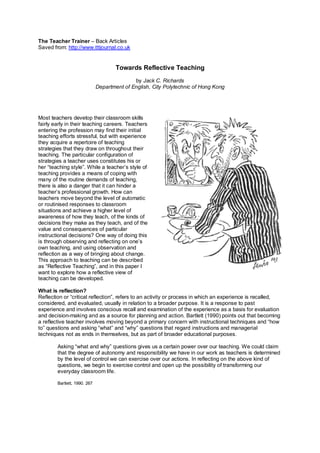 This document discusses reflective teaching and how teachers can develop a reflective approach to improve their practice. It describes reflection as evaluating past teaching experiences to inform future planning and decision-making. Teachers can engage in reflection individually through writing journals/self-reports or having their teaching observed/recorded, or collaboratively through peer observation and collaborative journaling. Reflective practices like these help teachers move beyond automatic responses to lessons to critically consider how and why they teach.