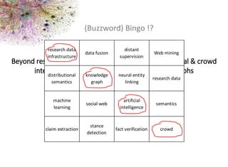 The document discusses leveraging artificial and crowd intelligence to build research knowledge graphs by focusing on the extraction and linking of research data from the web. It highlights methodologies for mining various forms of research data, such as dataset metadata, and explores challenges related to data quality, redundancy, and noise. The report also emphasizes the integration of social science data and computational techniques to enhance research capabilities in understanding claims, misinformation, and public opinion.