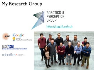 The document discusses the research and development of autonomous navigation for drones, focusing on vision-based and GPS-denied navigation methods. It highlights the applications of micro aerial vehicles in areas such as search and rescue, agriculture, and industrial inspection, and emphasizes the technological advancements in visual-inertial state estimation and dense 3D mapping. It also addresses challenges like robustness in dynamic environments and explores solutions like semi-direct visual odometry and probabilistic depth estimation.