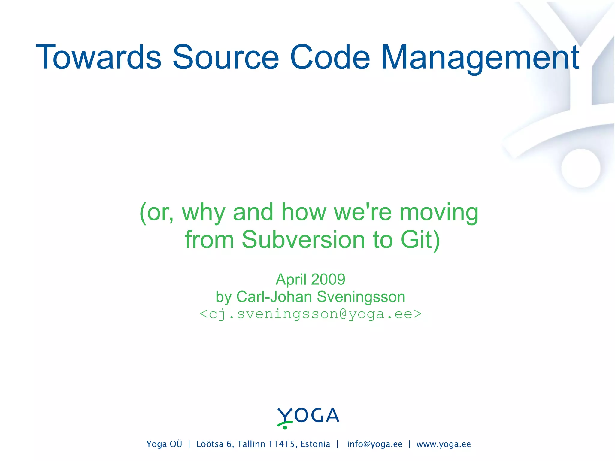 The document outlines the transition from Subversion to Git for source code management, detailing the advantages and workflows involved. It covers essential Git commands, branching strategies, and setup instructions for different operating systems. The document also provides links to additional resources and tutorials for further learning about Git.