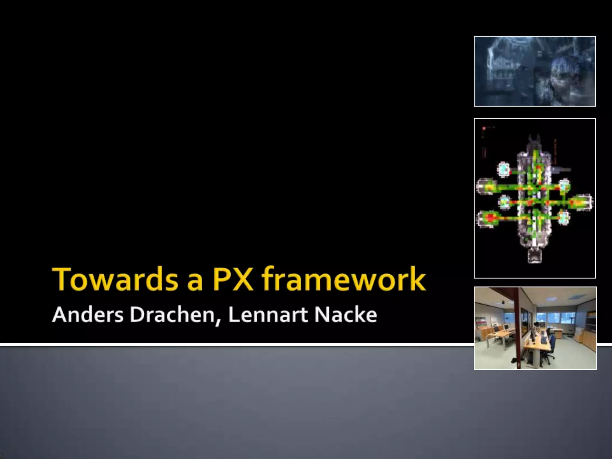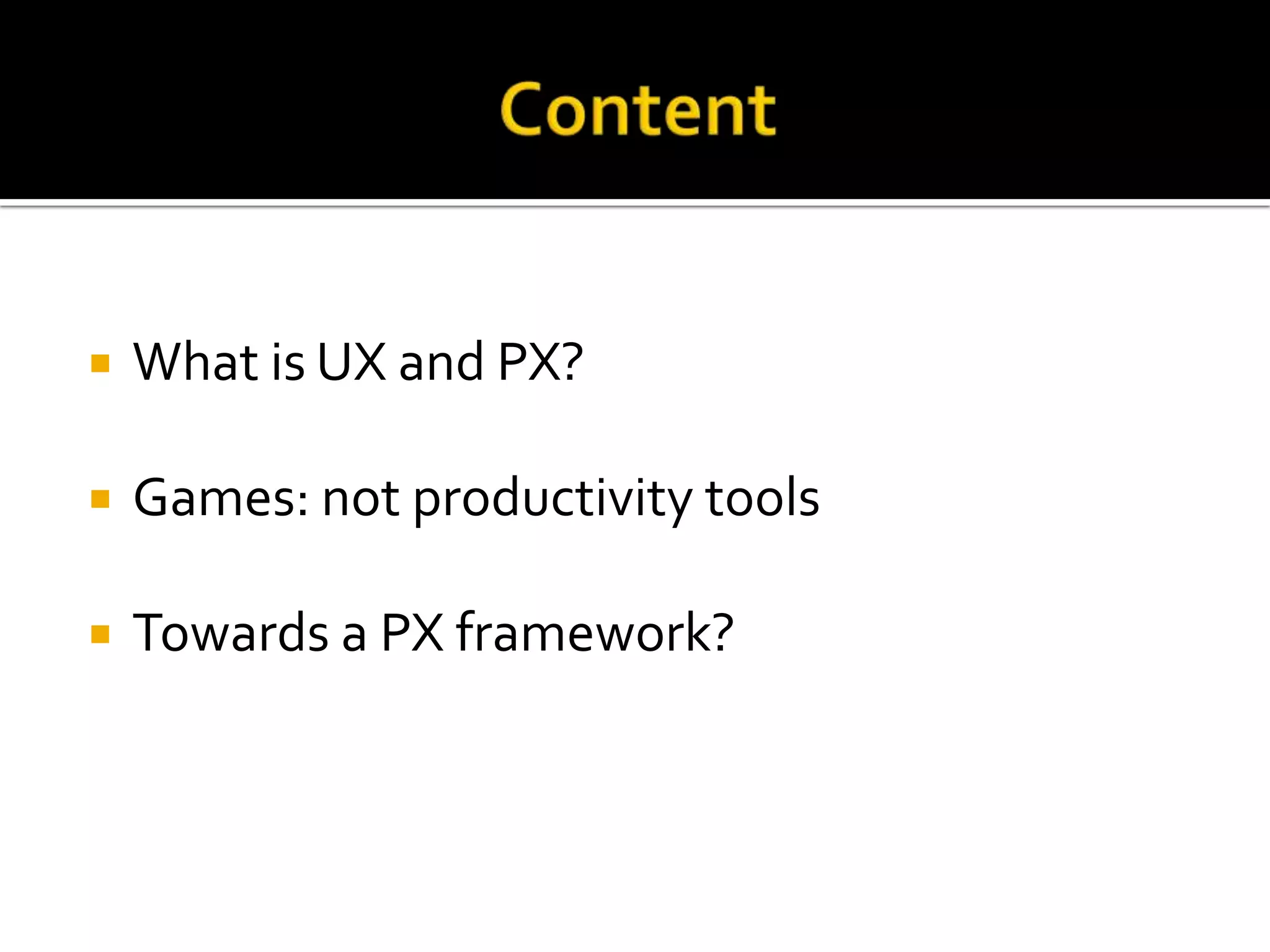 The document discusses the concept of Player Experience (PX) in games, emphasizing the need for a framework to evaluate it due to its complexity and the influence of various factors like context, emotional states, and time. PX is defined as the culmination of a player's feelings and perceptions before, during, and after gameplay, diverging from traditional user experience metrics used in productivity tools. It suggests that understanding and optimizing PX is crucial for game design, with an emphasis on the roles of both designers and players in shaping the experience.