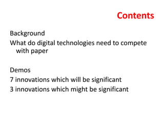 This document discusses innovations that could help reduce paper usage by improving digital technologies' ability to replicate paper's key attributes. It identifies 7 innovations like multi-touch screens and online annotations that will significantly help compete with paper, and 3 like virtual desktops and tablets that might help. Currently, digital tools don't provide the same quick, flexible navigation, reading across documents, marking up while reading, and interweaving reading and writing that paper allows.