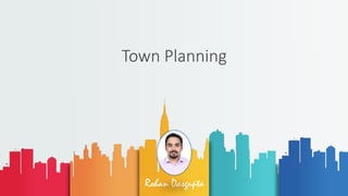 A town is defined as a settlement with over 5,000 people and specific socio-economic characteristics, while town planning aims to create healthy, convenient, and beautiful living environments. It involves zoning and the arrangement of various land uses to ensure infrastructure and amenities support urban living. Development plans are necessary for organized town growth and typically include detailed layouts of zones, roads, and amenities to guide future development.