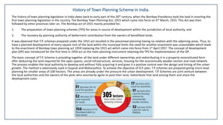 Town planning schemes are prepared under the Maharashtra Regional and Town Planning Act of 1966 to implement development plans covering areas under planning authorities. The schemes involve land pooling and reconstitution to provide infrastructure and redistribute plots. Objectives include pooling land, reconfiguring plots, and providing social and physical infrastructure while recovering costs. Historically, the first town planning legislation was the 1915 Bombay Town Planning Act, which was replaced in 1954 to introduce development plans as the main planning instrument. Town planning schemes are intended to implement development plan proposals through a joint process between local authorities and landowners to pool, redistribute land, and share development costs.