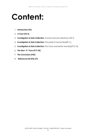 This document provides an overview of research conducted for a final project to design a better livable town called "X Town". It includes summaries of investigations into ancient and present towns/cities as well as concepts for future sustainable towns. Research looked at cities like Pompeii, London, and Amsterdam to understand their infrastructure, transportation systems, and planning approaches. Examples of sustainable future towns examined were Dockside Green in Canada and Masdar City in Abu Dhabi, noting their renewable energy systems, treatment of water and waste, and pedestrian-focused design. This background research will inform the planning and design of the new X Town project which aims to create a carbon neutral, socially connected, and environmentally-friendly township.