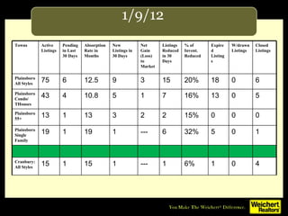 The document provides real estate data for multiple towns, including active listings, pending sales in the last 30 days, absorption rates, new listings, changes in inventory, expired and withdrawn listings, and closed sales. It shows figures for all property styles, condos/townhouses, properties for 55+, and single family homes. Absorption rates varied across areas from less than a month to over 2 years on average. New listings, reductions in inventory, and closed sales shifted markets up or down month-to-month in each town.