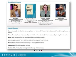This document summarizes an ELI town hall meeting that took place on October 13, 2010. It provides information about upcoming ELI events, including the annual meeting in Washington D.C. from February 14-16, 2011 that will take place both in-person and online. The document also outlines pre-conference seminars at the annual meeting, innovations at ELI, resources available from ELI like white papers and workshops, and ways to get involved with ELI initiatives.