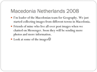 Vladimir Grujeski is leading a Macedonian geography team that is collecting images and information about towns in Macedonia from friends living in those towns. So far, the team has received initial photos of Gostivar, Strumica, Bitola, Prilep, Ohrid, and Kriva Palanka, and they are expecting to receive more photos and details soon from contributors living in those towns.