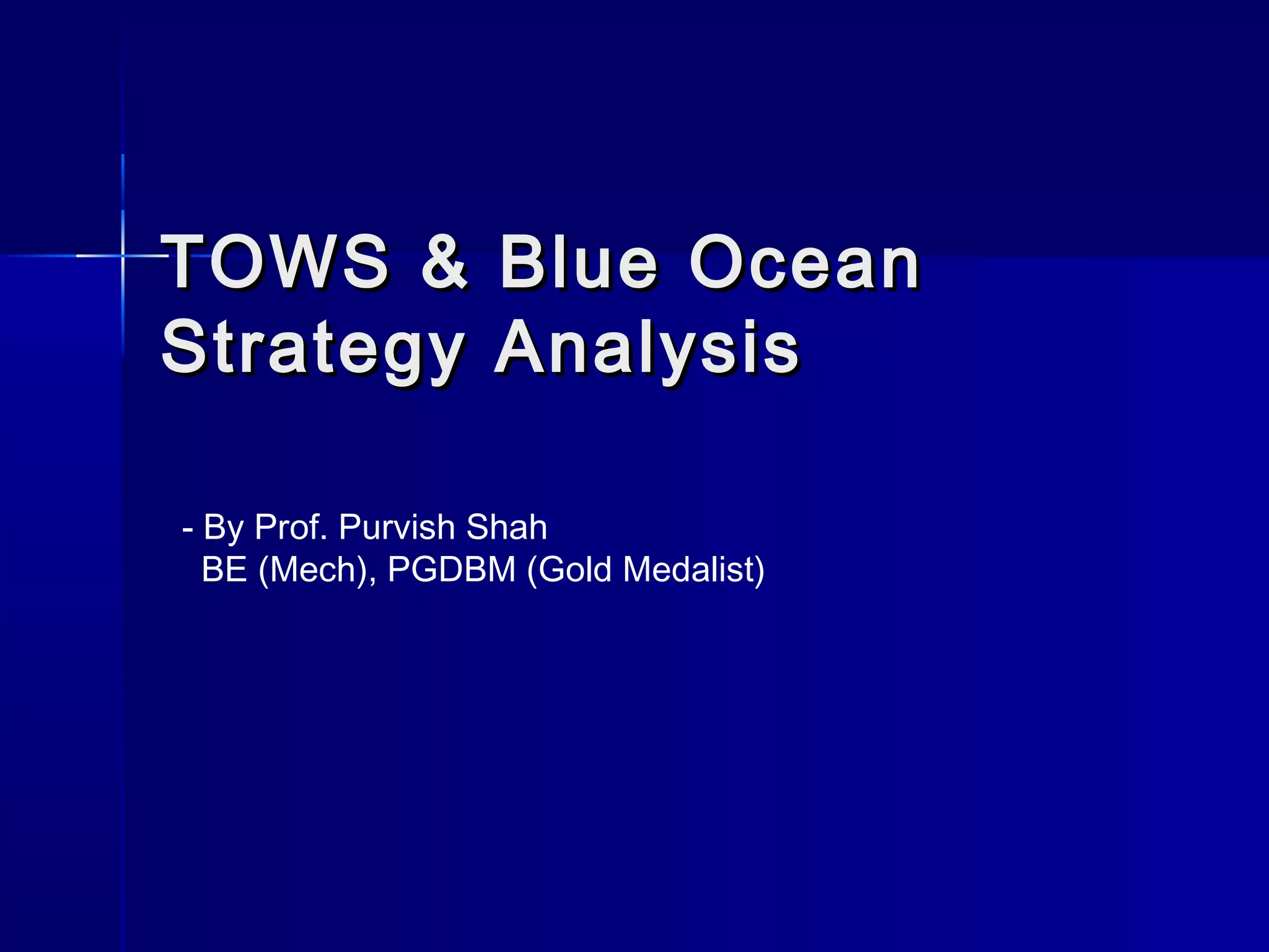 This document discusses TOWS analysis and Blue Ocean strategy. It explains that TOWS and SWOT analyses are similar but TOWS relates internal strengths and weaknesses to external opportunities and threats to develop future strategies. Blue Ocean strategy involves creating a new market space rather than competing in existing markets. The document provides examples of TOWS analysis for Volkswagen entering the US market and examples of Blue Ocean strategies like the Tata Nano car and new products from Paras Pharma and Cavinkare.