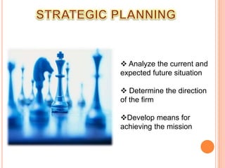The document discusses strategic planning and the TOWS matrix. The TOWS matrix is a framework that helps match an organization's internal weaknesses and strengths with external threats and opportunities. It is used to develop four types of strategies: WT focuses on minimizing weaknesses and threats; WO aims to minimize weaknesses and maximize opportunities; ST attempts to use strengths against threats; and SO capitalizes on strengths to pursue opportunities. The TOWS matrix is a tool for systematically analyzing an organization's situation over time as external and internal environments are dynamic.