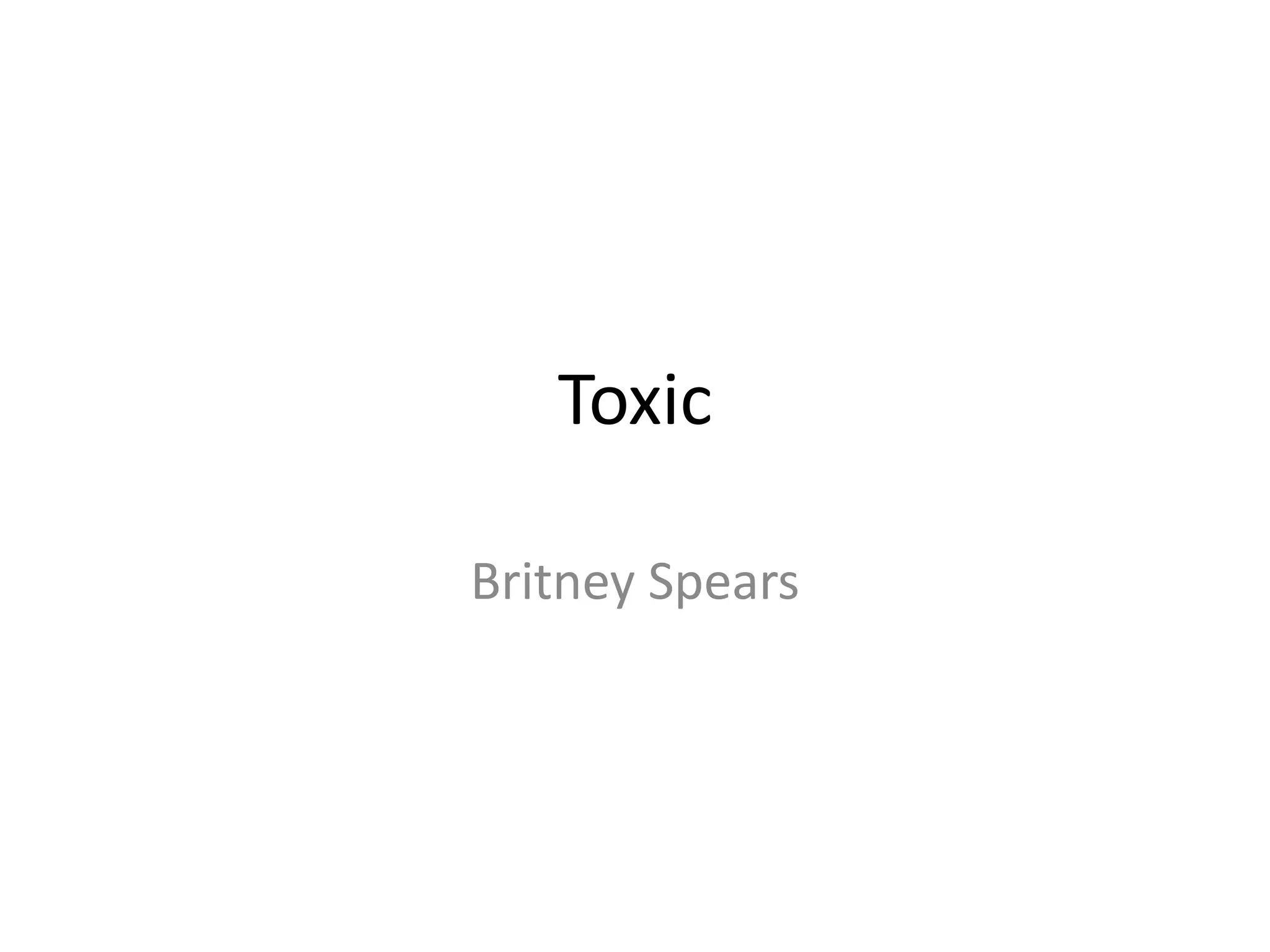 The "Toxic" music video by Britney Spears is extremely voyeuristic due to her revealing costumes and dance routines, which reflects her established star image. There are many close-ups of Spears throughout the video, highlighting her star power and potentially fulfilling the demands of her record label. Visual elements in the video link to the lyrics of the song, such as when Britney gives a man toxic poison at the end, creating a narrative to accompany the music. Both narrative elements and Spears' performance make the video unique compared to other pop music videos analyzed.