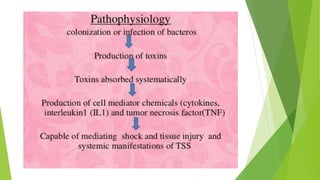 Toxic shock syndrome is a life-threatening condition caused by toxins produced by Staphylococcus aureus or Streptococcus pyogenes bacteria. It most often affects menstruating women under 30 using tampons. Symptoms include high fever, low blood pressure, rash, and potentially organ damage. Treatment requires intensive care, antibiotics, IV fluids and potentially surgery to drain infections. With treatment, 5-10% of patients may die from toxic shock syndrome.