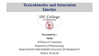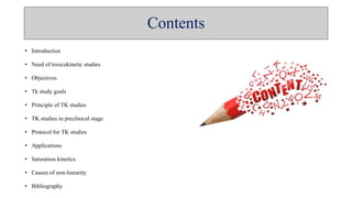 The document discusses toxicokinetics, which involves the study of drug safety evaluation through the generation of pharmacokinetic data across different animal species. It outlines the objectives, principles, and applications of toxicokinetic studies, as well as the importance of saturation kinetics in non-linear pharmacokinetics. Additionally, it emphasizes the need for such studies in drug development and clinical safety assessments.
