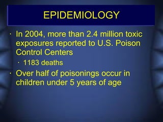 This document discusses toxicologic emergencies. It provides statistics on poisonings in the US and outlines the evaluation and management of poisoned patients. Key aspects of the history and physical exam are reviewed. Common toxidromes such as anticholinergic, opioid, and serotonin syndrome are described. Methods of decontamination, enhanced elimination, and use of antidotes are also outlined. Two case examples involving acetaminophen toxicity and carbon monoxide poisoning are then presented and discussed.