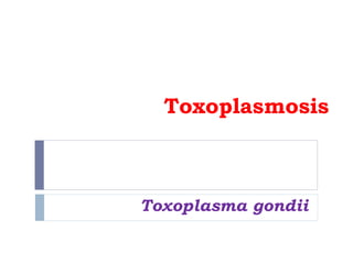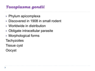 Toxoplasmosis is caused by the parasite Toxoplasma gondii, which was discovered in 1908. It has three morphological forms - tachyzoites, tissue cysts, and oocysts. Cats and other felines are the definitive host where sexual reproduction occurs producing oocysts, while intermediate hosts like humans can be infected by ingesting oocysts or tissue cysts. Infection can cause mild symptoms but can also cause serious issues if a fetus is infected or in immunocompromised individuals. Both humoral and cellular immunity help the body fight off the parasite.