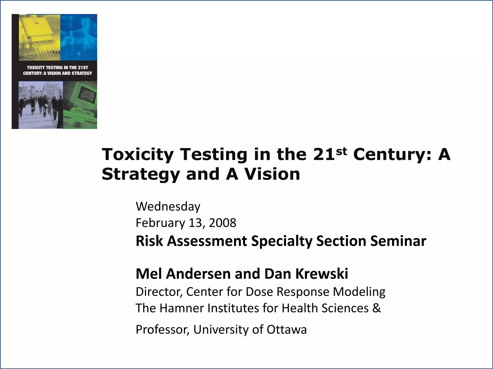 The document outlines a strategy and vision for modernizing toxicity testing in the 21st century. It proposes moving away from traditional animal testing approaches and instead focusing on assessing perturbations of toxicity pathways in human cells through high-throughput in vitro screening. This would allow testing a much broader range of chemicals at lower costs and with fewer animals. Computational modeling of dose-response relationships would be used to extrapolate in vitro results for risk assessment purposes. The approach has implications for toxicity testing practices and regulations. Overall, the vision is to create a new paradigm centered on human pathways rather than apical animal outcomes.