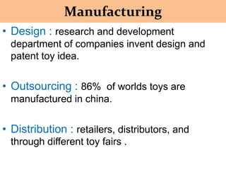 1) Toys are designed by companies' R&D departments, manufactured mostly in China (86%), and distributed through retailers, distributors, and toy fairs.