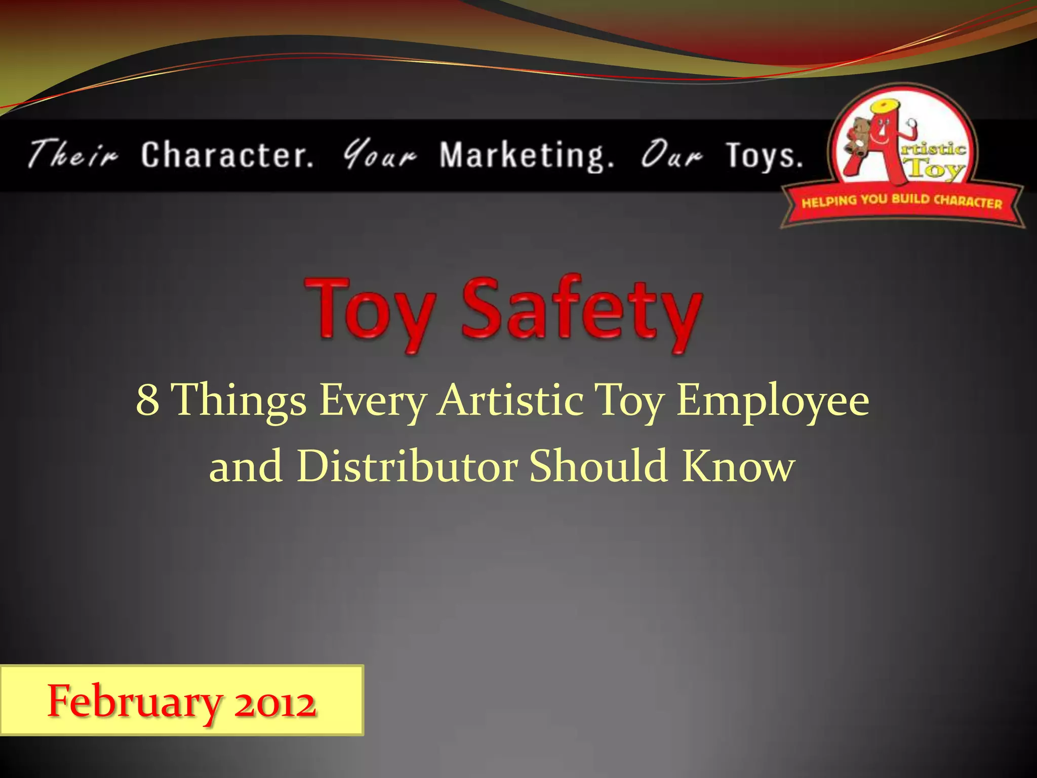 The document outlines essential information for artistic toy employees and distributors, including types of safety tests required for toys and their associated costs. It specifies that products manufactured post-January 1, 2012 must undergo independent safety testing conducted by accredited laboratories, with significant penalties for non-compliance. Additionally, it details requirements for product safety information and certification for imported toys and emphasizes the importance of maintaining compliance with safety standards.