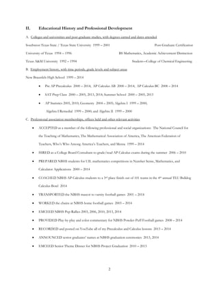 This document provides details about the author's educational and professional background as a high school math teacher. It outlines their education history, including degrees earned in mathematics from Texas State University and the University of Texas. It then details their 15 year employment history teaching various math courses at New Braunfels High School. The document also lists the author's extensive involvement in professional organizations and leadership activities in math education. Finally, it shares a personal anecdote about how the author began their teaching career after being encouraged by another teacher and has sought to motivate students through creative lessons that go beyond mathematics.
