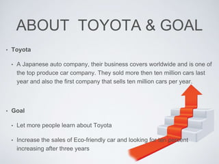 Toyota is a major Japanese automaker that sells over 10 million vehicles per year. They aim to increase sales of their eco-friendly hybrid, electric, and plug-in hybrid vehicles by 10% over three years through a marketing campaign targeting young, budget-conscious commuters and those seeking short-distance cars. The campaign will use social media, print advertising, and TV commercials featuring messages about Toyota, eco-cars, hybrids, and gas savings. Performance will be measured using Toyota's annual sales reports and metrics from social media, TV stations, and print publications.