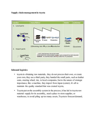 Toyota is a global auto manufacturer known for its lean manufacturing system called the Toyota Production System (TPS). The objectives of TPS are to produce vehicles as quickly and efficiently as possible based on customer orders. Toyota uses a combination of local sourcing and imports from Japan for raw materials. It practices just-in-time production and continuous flow processing. Finished vehicles are sent directly from plants to Toyota dealers. Toyota has a global network of over 45 plants with flexibility to supply different markets and regions.
